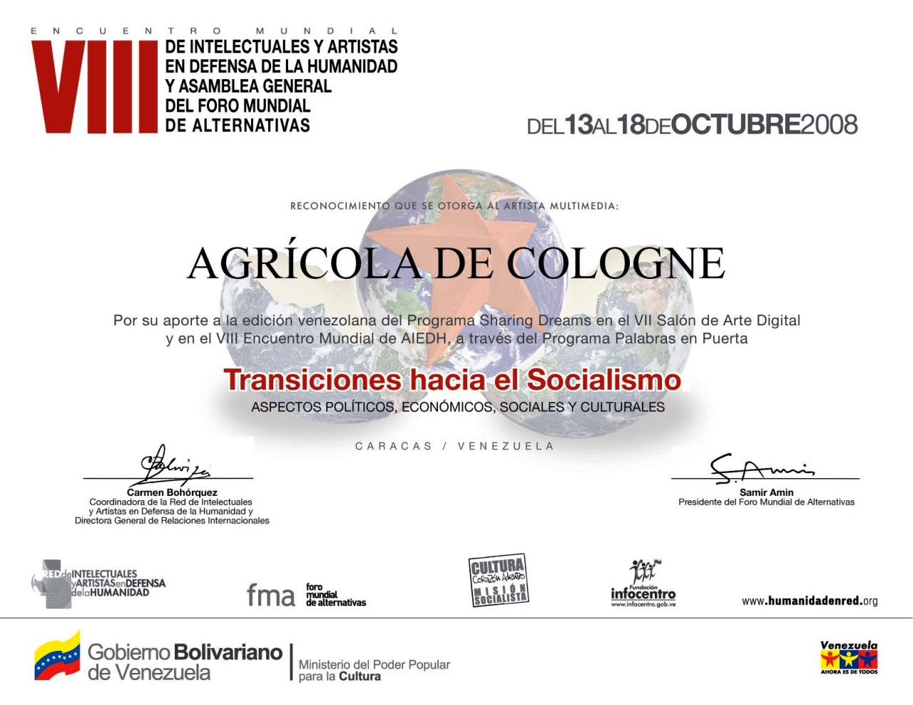 VIII World Meeting of Intellectuals & Artists Caracas/Ve – 13-18 October 2008