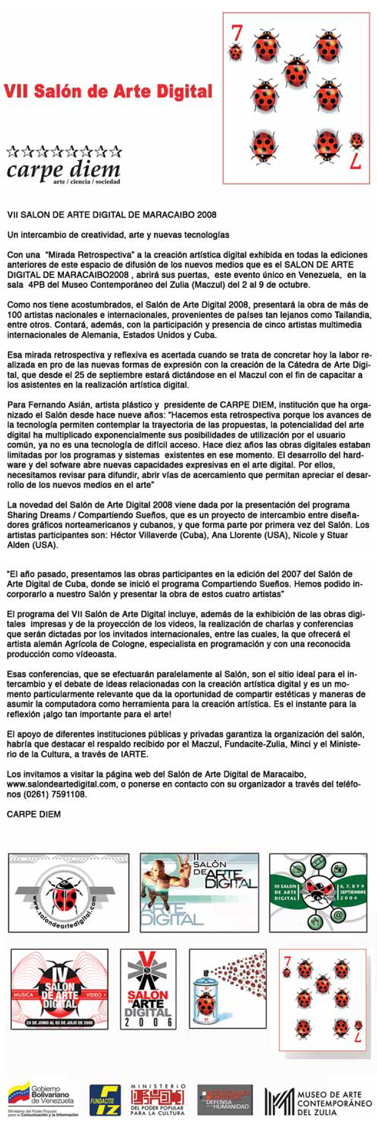 Presented by CARPE DIEM, the 2008 edition of the Maracaibo Digital Art Room was inaugurated, in room 4 of the Museum of Contemporary Art of Zulia (MACZUL) which offers us, in its varied program, a tour of the recent work of participants from previous editions in Digital Image, with the exhibition of more than 70 works.