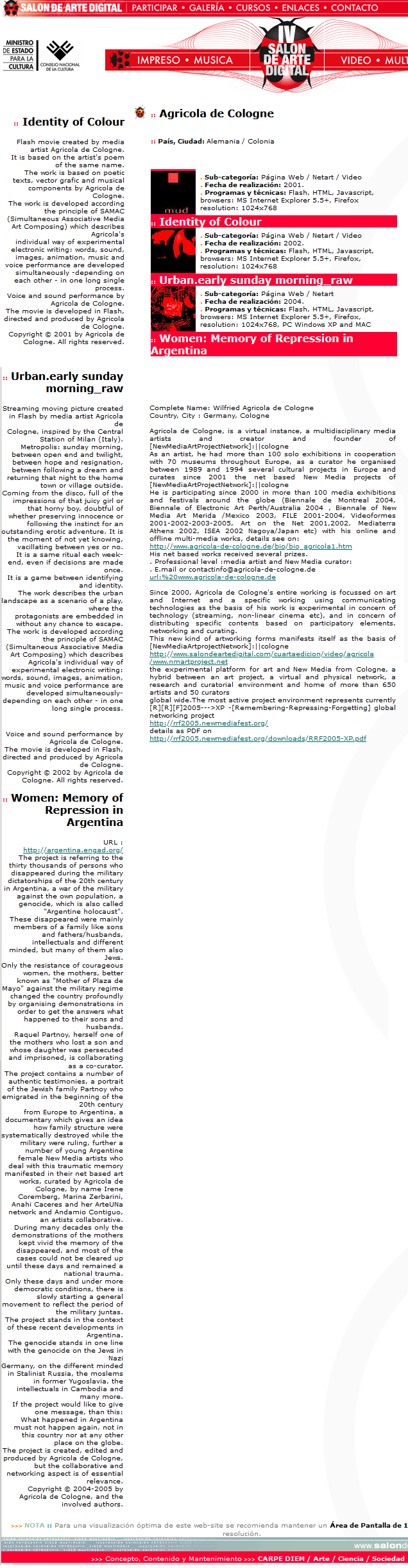 El videoasta alemán, Agrícola de Cologne, Director del Java Museum, aporta al salón su red internacional de videos http://coff.newmediafest.org, que agrupa la obra de cuatro festivales y cerca de quince mil videoastas de 70 países. Esta exhibición on line dio inicio al evento y será presentada diariamente por su curador en persona para intercambiar ideas con el público asistente.