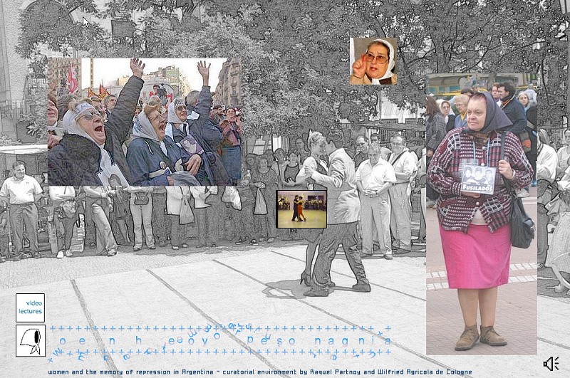 The project contains a number of authentic testimonies, a portrait of the Jewish family Partnoy who emigrated in the beginning of the 20th century from Europe to Argentina, a documentary which gives an idea how family structure were systematically destroyed while the military were ruling, further a number of young Argentine female New Media artists who deal with this traumatic memory manifested in their net based art works, curated by Agricola de Cologne, by name Irene Coremberg, Marina Zerbarini, Anahi Caceres and her Arte UNa network and Andamio Contiguo, an artists collaborative.